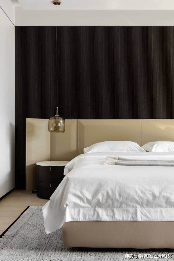 私密场域依旧保持静谧,黑白色基础上搭配了更多的色彩,例如深棕、浅紫等,艺术品的衬托深邃迷人,热络了家的氛围。