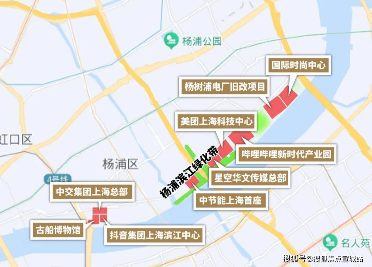 杨浦滨江拥有美团上海科技中心、bilibili全球总部等大型企业总部;区域内还拥有字节跳动上海滨江中心、中交集团上海总部、中国节能·上海首座等企业上海总部落址,预计产业规模达3000亿,导入至少20万人口。