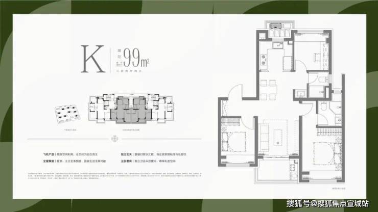 实现了大面宽横厅的飞机户型设计,使得南向的开间,全部布置为客厅、主卧和次卧三个最重要的功能区;北向房间则布置了次要的厨房、次卫、书房和主卫功能,最优化的提供南向面宽和缩窄户型整体进深,提升户型整体的采光和通风。