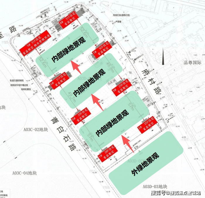 面对这样一个方正的长条形地块,多数项目大概率会按照常规思路,在社区中间打造一个“楼王”独享最优楼间距与核心景观.