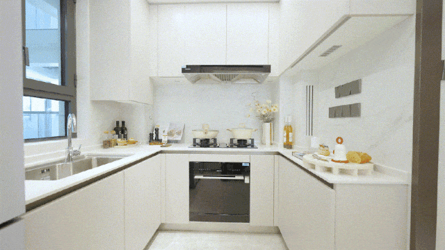 厨房则配备西门子厨房三件套——洗碗机(8套)、燃气灶、抽油烟机,将先进科技融入厨房生活;还有弗兰卡大尺寸水槽,使用方便;并且采用前置净水设备,用水更放心;操作台面是仿石材台面,美观大气又易清洁。