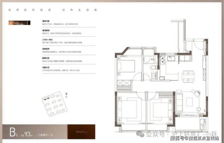 「尚湾林语」即将推出的约93㎡三房户型,打破了传统紧凑型小户型的局限,其得房率接近80%,远超同类市场产品。具体来看下户型设计: