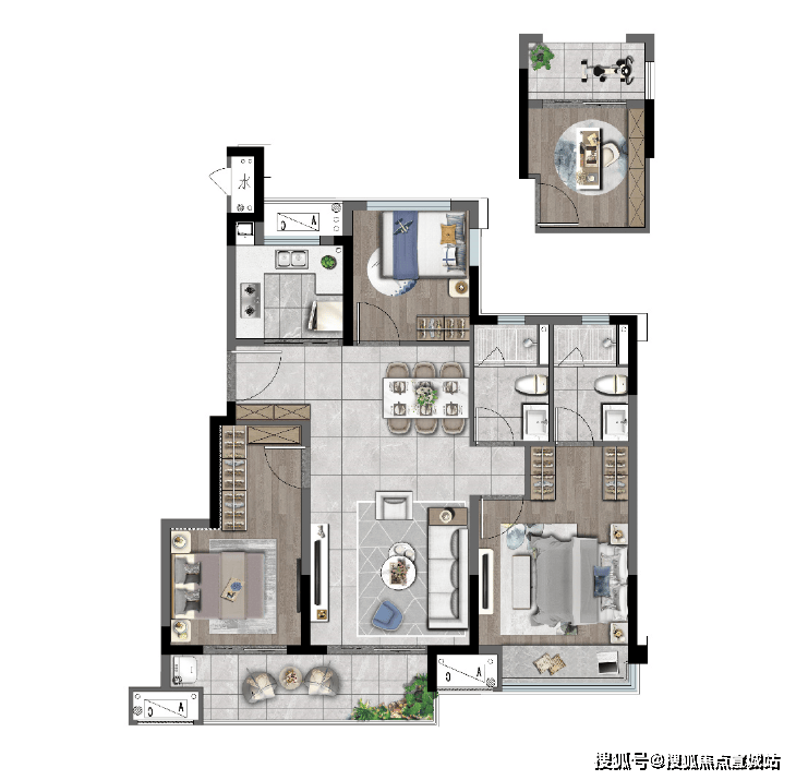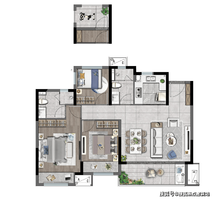 其次,该户型还做到了真正的动静分区。卧室的私密性完全不受公区影响,将舒适度与空间感拿捏得当。