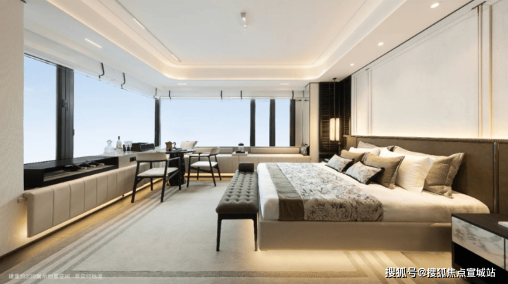 主卧“小家化”,面积达到了约50㎡(包含不计产权面积部分),以“总裁行政级套房”标准打造。270°超广角环景主卧+270°豪华风景卫浴间,与世界星级酒店生活保持同频。整个卧室如同一座空中庭院,全维采光通风。