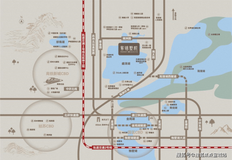 项目位于相城区阳澄湖镇湘州路199号,地处北双湖板块核心,距苏州高铁北站仅10分钟车程,30分钟可达园区主城1。相城区正推进"大疏大密"规划,高铁新城将打造为立体通达的城市空间
