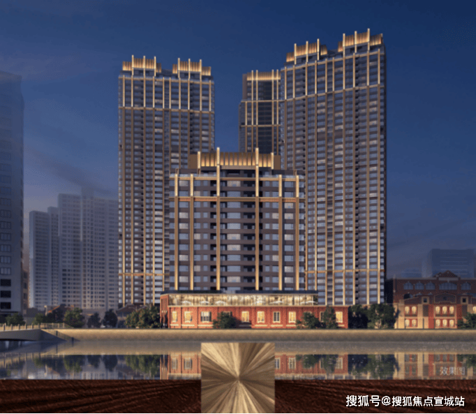 经典三段式,承基座之稳,中间标准段与塔冠形成丰富层次感。采用古铜色、深灰色等古典主义建筑色调,建筑基座“人字纹”竖向线条、立面层次,形成高耸、挺拔、向上的建筑气质,既有历史厚重感,又赋予摩登精神的感召力。