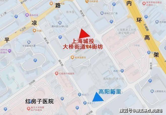 「興華里」(大桥街道94街坊)地块四至范围, 东至渭南路,南至沈阳路,西至02F1-02、02F1-03地块,北至平凉路。项目距离上海城投上一个板块内住宅项目高阳新里仅一个路口街区之隔,直线距离200米左右。