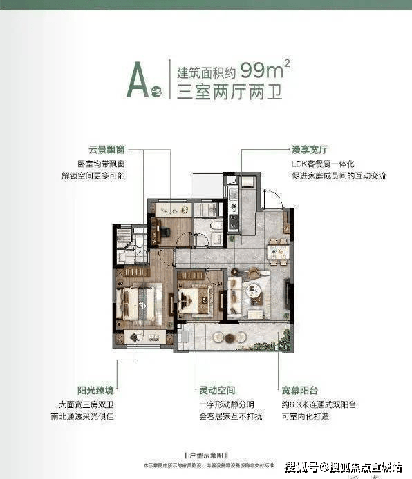 户型设计:建面约99-135㎡全双卫户型,配置中央空调、新风系统,严选一线家装品牌,如方太油烟机、大自然地板、科勒智能马桶盖、美的中央空调等。