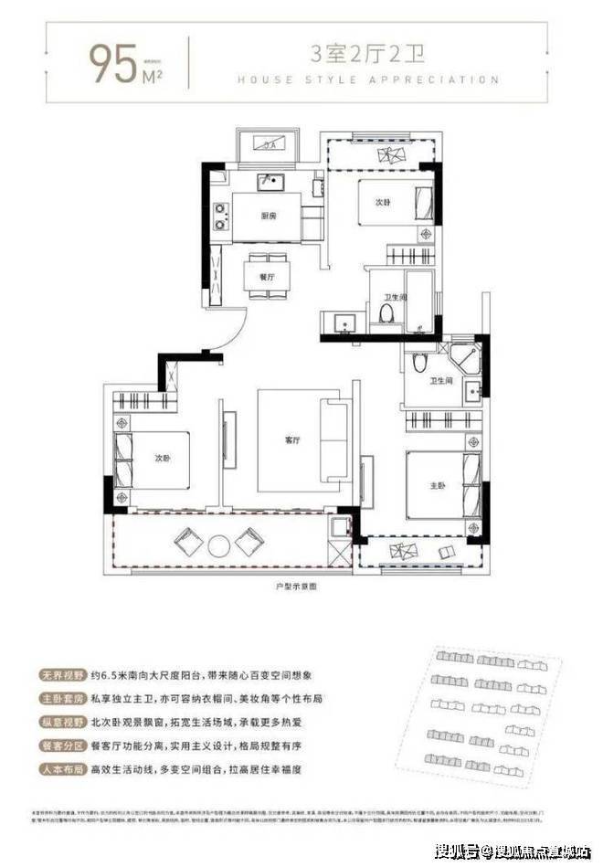 95㎡三居:3室2厅2卫,南朝向,总价约125万-140万