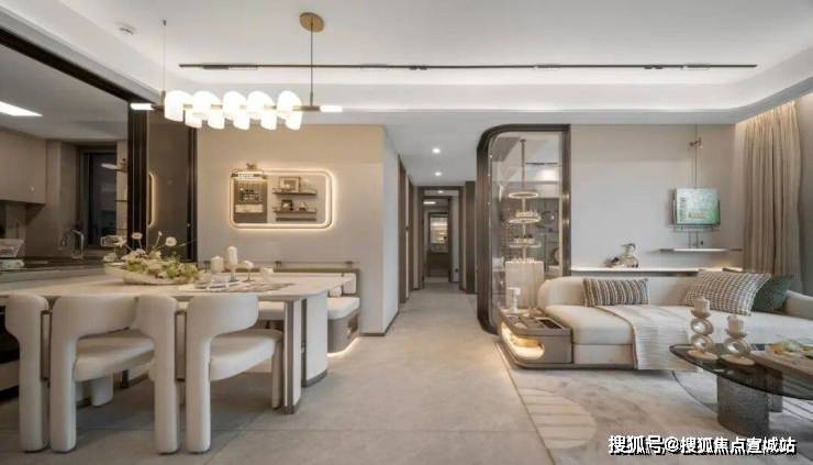 - 94㎡三房:三开间朝南,南向面宽近10米,1.5米进深阳台,独创“S墙”嵌入双开门冰箱。
