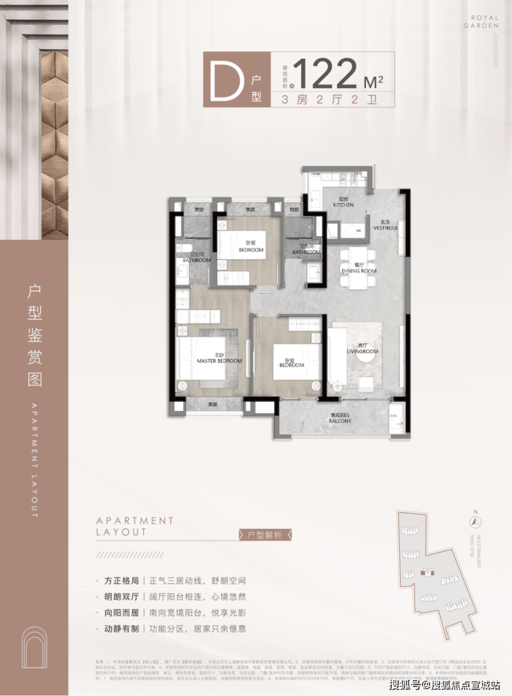 四大轴线:三个入口轴线和中心水轴。全区花园式入户体验,入户门楼结合花坛景墙和别致的地坪铺装,为业主提供尊享、温馨的归家体验。