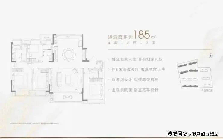 建面约185㎡户型:4室2厅3卫配置,增加一个多功能房间,可作为书房或儿童房,主卧空间更为宽敞,配备双台盆主卫和独立浴缸,客厅面宽达6米,采光极佳