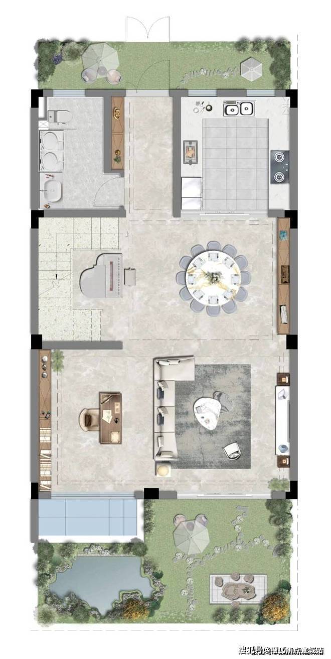 交控和悦里售楼处电话☎:400-882-8814(预约热线)✔✔✔面约197㎡排屋 一层装修示意图,非交付标准。庭院空间仅供展示,实际为小区绿地用途,院内绿化、装修及物品均不属于交付范围。
