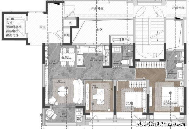 1号楼与2号楼的99㎡B户型,一梯两户的配置,实现三开间朝南的宽敞格局,加之横厅设计,使得自然光线充分涌入室内。