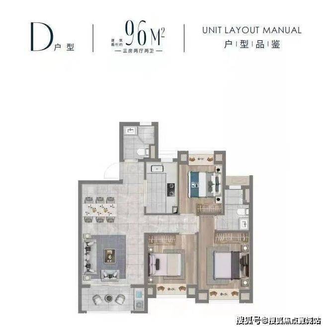 D户型建面约96㎡三房两厅两卫▼