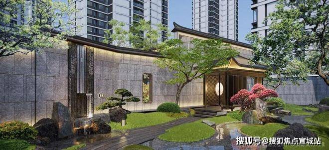 项目以门庭为礼序之始,南、北区各配置磅礴威严国风大门,为每一次回归赋予尊贵仪式感;建筑立面,三面大面积铝板+玻璃、涂料等用材,雕梁画栋国风意境,简约不失华贵;多进式归家园林,汲江南山水、历史源流、人文风物之精髓,绘就东方山水画卷。