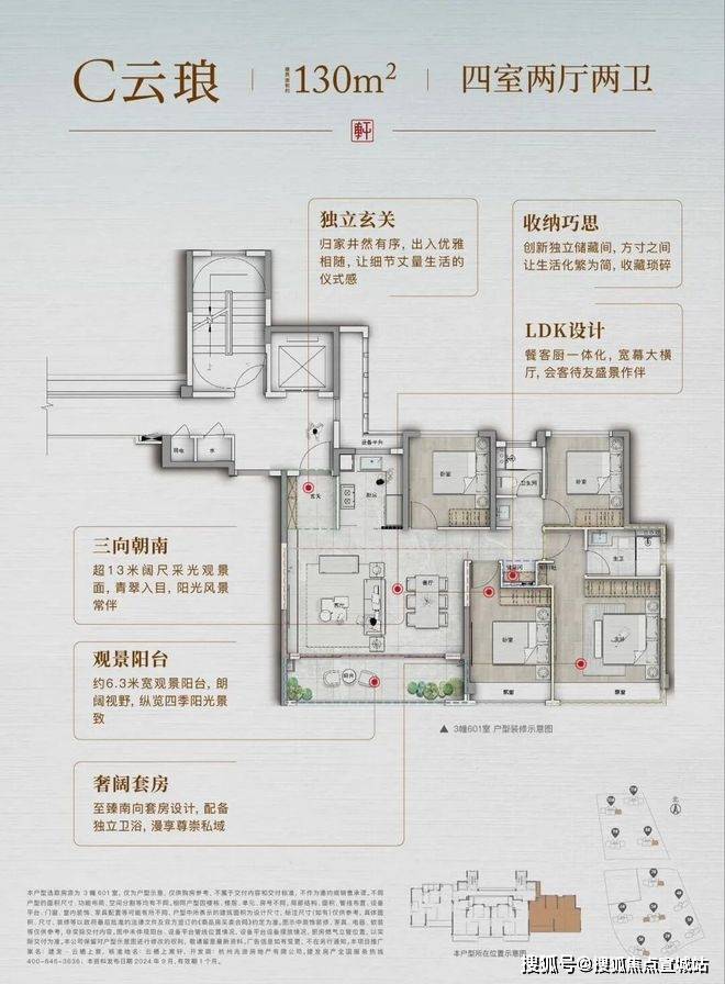 建面约 140㎡四房:为楼王户型,6.2 米横厅 + 双套房,南向面宽 16.35 米,主卧套房含独立衣帽间 + 双台盆主卫,仅剩 34 套房源,总价约 476 万起。