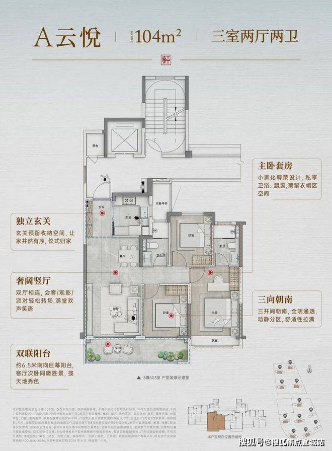 建面约 104㎡三房:四开间朝南,南向面宽约 12.8 米,有 6.5 米双联阳台,LDKB 一体化厅,独立玄关 + 双卫设计。