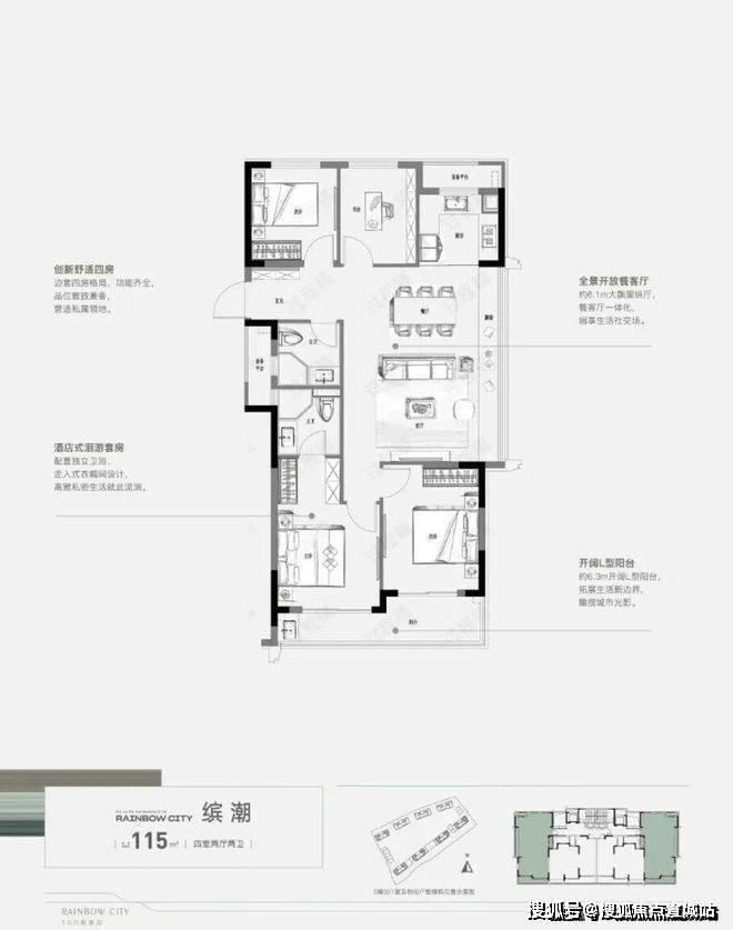 得房率:83%-88%,其中96㎡户型得房率88%,115㎡户型得房率85%,130㎡户型得房率83%。