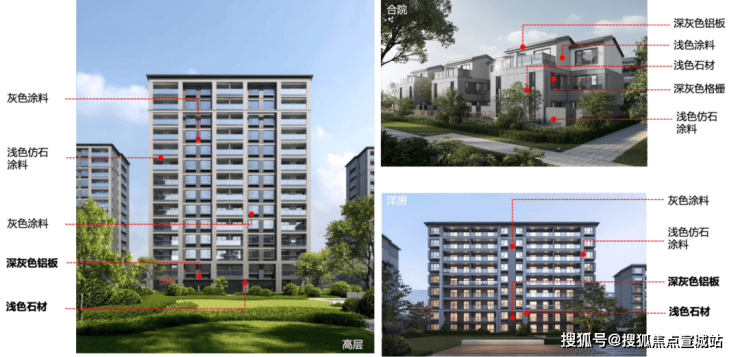 星缦和润城整体建筑风貌以精致有力的线条为主要构成元素,且具有简洁通透的立面。项目建筑设计合理呼应这两种城市设计元素。灰白对比的主色调,突出典雅的调性。保留宋式传统元素,并通过大面积玻璃、涂料、首二层石材+铝线条等简洁而现代手法,匹配现代品质生活。