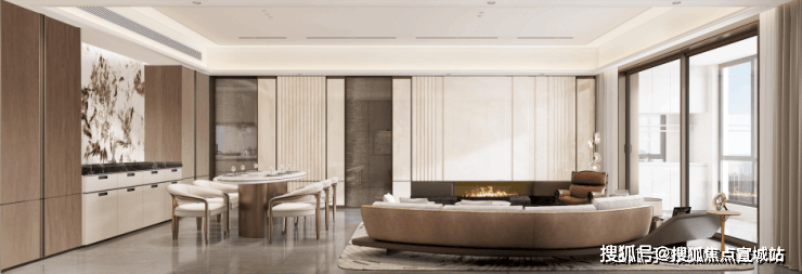 建筑风格:外立面以浅米色石材搭配深灰色金属线条,局部点缀木色格栅,兼具中式典雅韵味与现代简约风格。