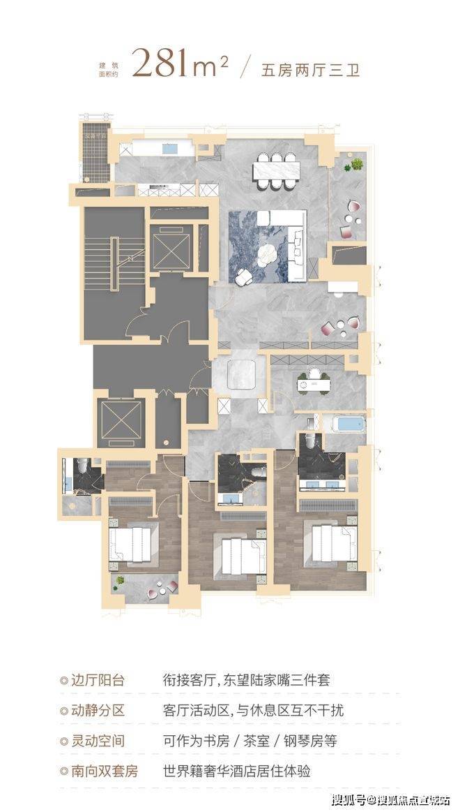 顶豪社交空间格局,普遍只有餐厅、客厅和阳台,该户型在南侧配置了一个家庭厅着实巧妙,可以是业主的茶室,也可以是女主人的手工室,当然也可作为X空间,随家庭结构和需求随心定制,书房、学习区、游戏区,女王化妆间等皆可。