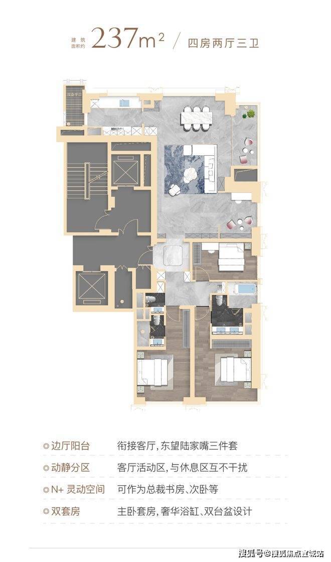 超高层:主力户型为 90-600㎡,其中主力为 193-402㎡天幕平层,得房率约 81%。