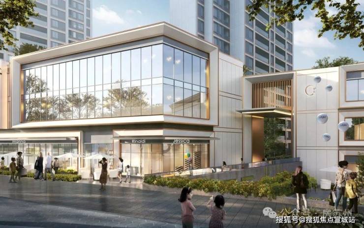 商业大面积玻璃幕墙立面,住宅与商业立面颜色协调统一