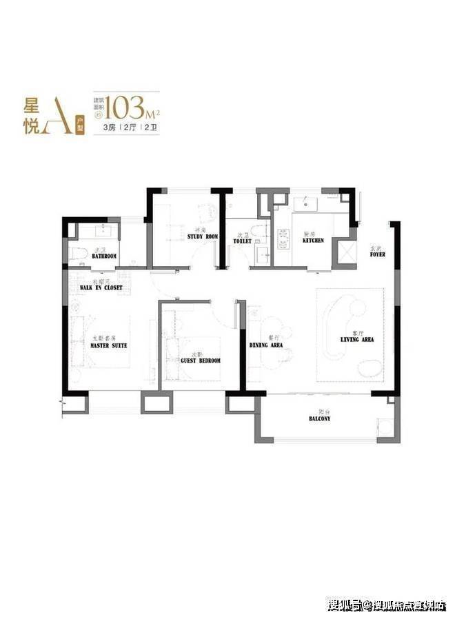 项目约103-107㎡3房2卫设计,有着宽绰的大横厅设计,并且3.5开间朝南。