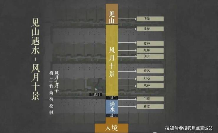 中国人自古讲究归家礼序,门第之尊;久映颂月将传统中式建筑的礼序空间融入整体的规划布局中,形成一坊八巷-置坊入巷-穿巷入户的三重归家礼序。
