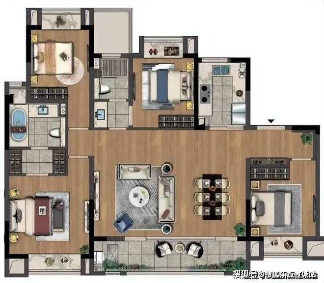 该户型4开间朝南14.3米,餐客厅开间7.2米,主卧开间3.9米,南次卧开间3.2米,西北次卧开间2.9米,东北次卧开间3米,厨房开间2.4*3.1米。