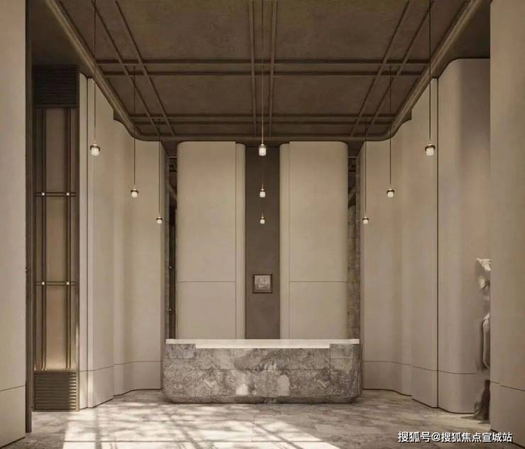 “回归之境”以3500㎡下沉水苑为核心,汇聚会客、泳池、茶室等多功能空间,形成仪式感十足的社区舞台。