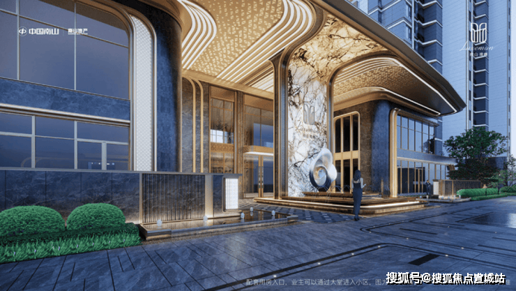 嘉定主城最大入户门庭,约45米奢阔尺度,采用宾利飞翼造型,彰显显赫门楣。