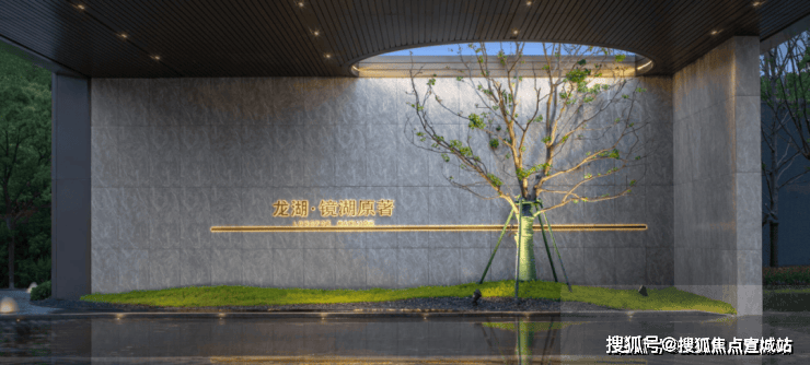 归家动线上,采用高端酒店的设计手法,打造了约28m宽、约5m高的超奢华入口展示面,考究和精致的景观设计,在此还自然于镜湖。