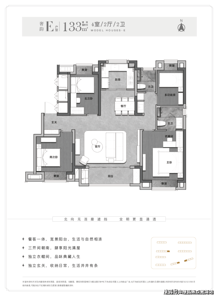 建面约133㎡4房2厅2卫,升级改善大四房。南向总开间约12.8米,四叶草布局,全明通透,动线清晰。