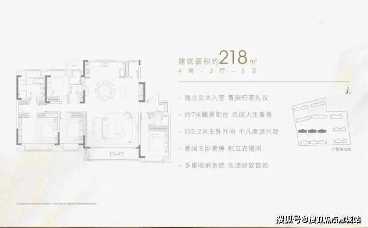 户型信息:主打 135-225 平方米全龄改善户型,主力为四居室布局。其中 135 平方米户型为 3 室 2 厅 2 卫,三开间朝南;160 平方米户型为 4 室 2 厅 2 卫,南北通透;185 平方米户型为 4 室 2 厅 3 卫,主卧配备双台盆主卫与独立浴缸;225 平方米顶层退台洋房,拥有 270° 环幕视野和专属星空露台。