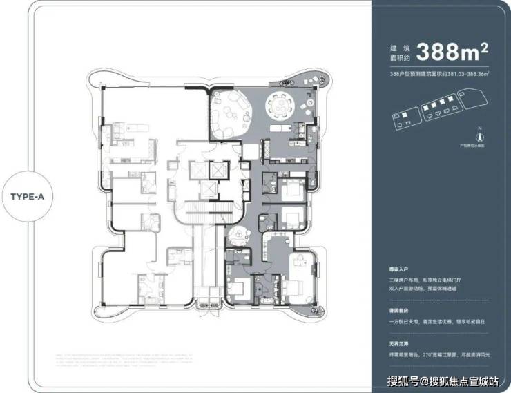 约388m²户型均位于滨江首排,底部架空3层高度约16米(1号楼),最大程度的保证临江第一排拥有270°环幕观江视野。西边套更能收获陆家嘴城市景观视野,高区卧室窗景收纳陆家嘴四件套,窗框即画框;东边套则可以将杨浦大桥及北滨江互联网产业帝国一览无余,每栋仅22套,珍藏价值拉满!