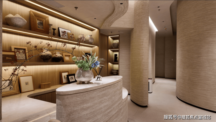 本次开放的6号楼实景大堂,一层单元入户大堂约7米挑高空间,自带归家仪式感。整体风格简约、艺术,圆弧形纹理的吊顶再次呼应整体曲线设计语言,搭配暖色灯光和大面积落地窗,既保证了整个空间的通透敞亮,视野无阻,又巧妙地柔化了氛围,让硬朗的建筑多了份优雅与温馨。