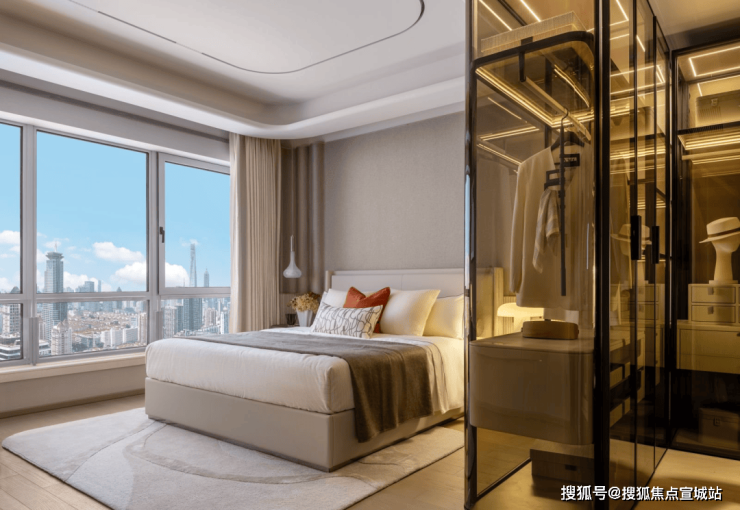 超约70㎡的南向主卧套房,是对品质生活的深层解读。将景观视野最大化地引入室内,并集成了功能完备的豪华卫浴与储物系统,主卧连通蝶形的阳台设计,实现了“套房即小家”的便利与尊享。