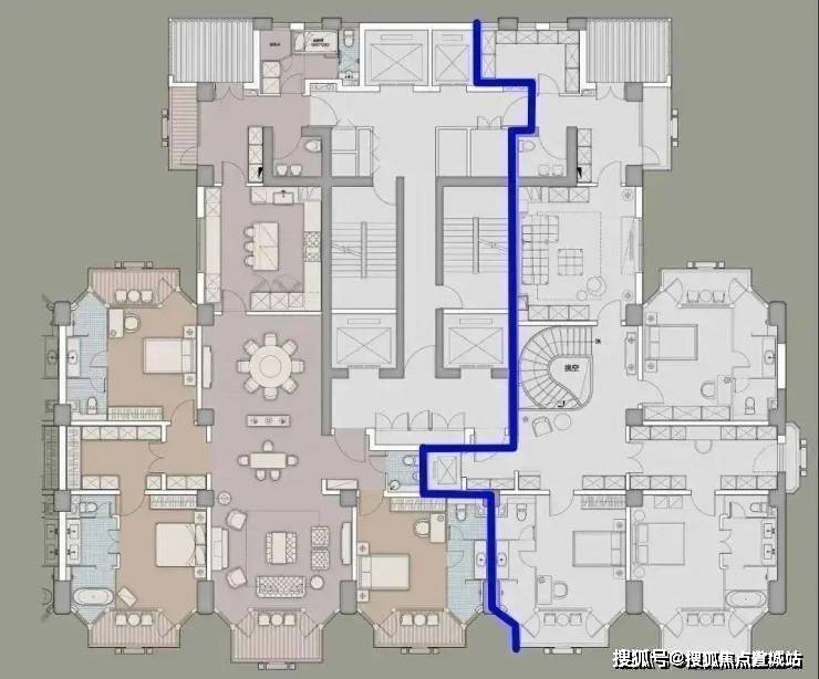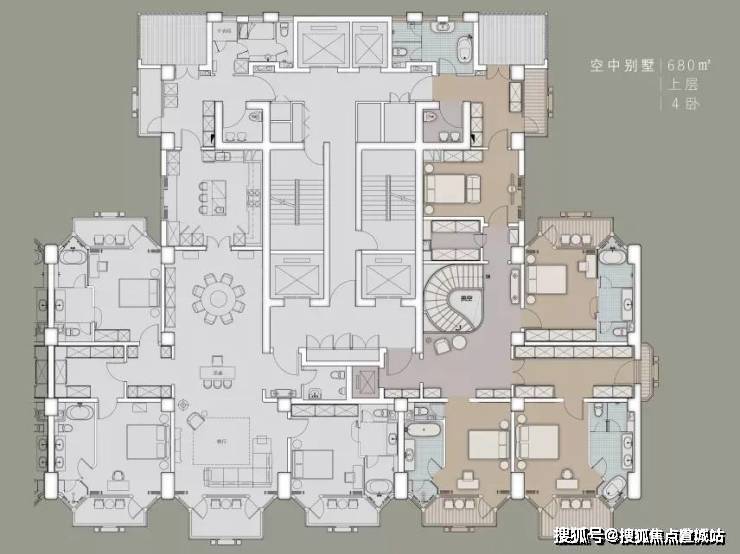 右面是680㎡复式套的一半(单层),同样户型随便创意,而且每户都配备了室内电梯,以及,这个户型上下共有10个阳台!