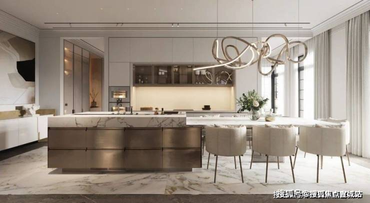 在厨房的设计中依然沿袭客厅的设计采用大理石元素,通过金属元素与大理石元素的结合来表现空间的轻奢,其中金属的岛台加上大理石台面让空间极具氛围感,让空间看上去更有层次。
