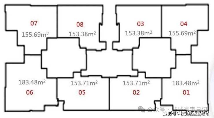 该栋分为A/B单元,每个单元有四个单位:包含3套153㎡及1套183㎡,平面布局与住宅相似。