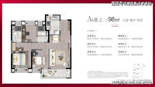 建面约98㎡3房2厅2卫户型,分别是边套、中间套,满足不同人群的居住需求。
