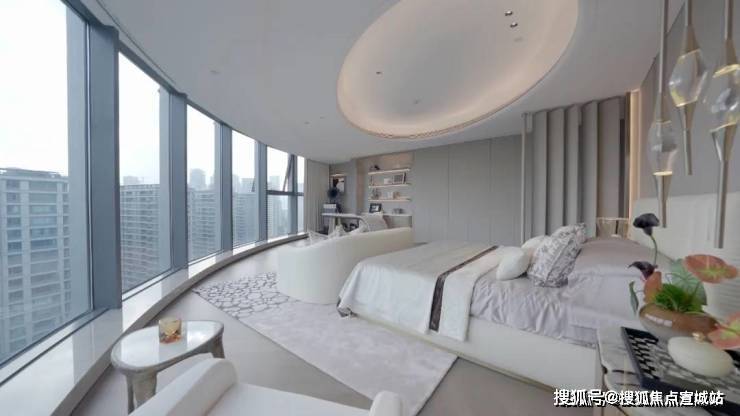 约450㎡“香奈儿”西边套,将原本多见于餐桌和墙面的白金沙奢石,漫铺于双厅地面之上。浅淡得宜的洁白,温润如玉的蜜色,将空间衬得时髦优雅。能眺望钱江两岸的梦幻天际线,“宇宙中心”奥体尽收眼底,也能俯瞰城市霓虹,车水马龙就在脚下。整个中心的璀璨世界定格在落地窗前,像一张巨幅明信片。