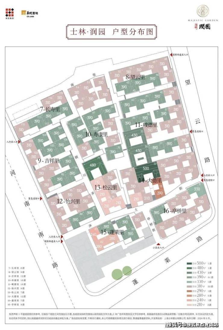 合院地上三层,面积段约210-500㎡,计合院82套。