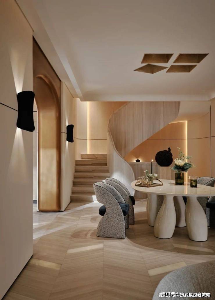 一层室内的天花都特别设计了梯形装置,增加了空间向着顶部不断延伸的纵深感,且镶以手作金箔贴面,浑然天成。