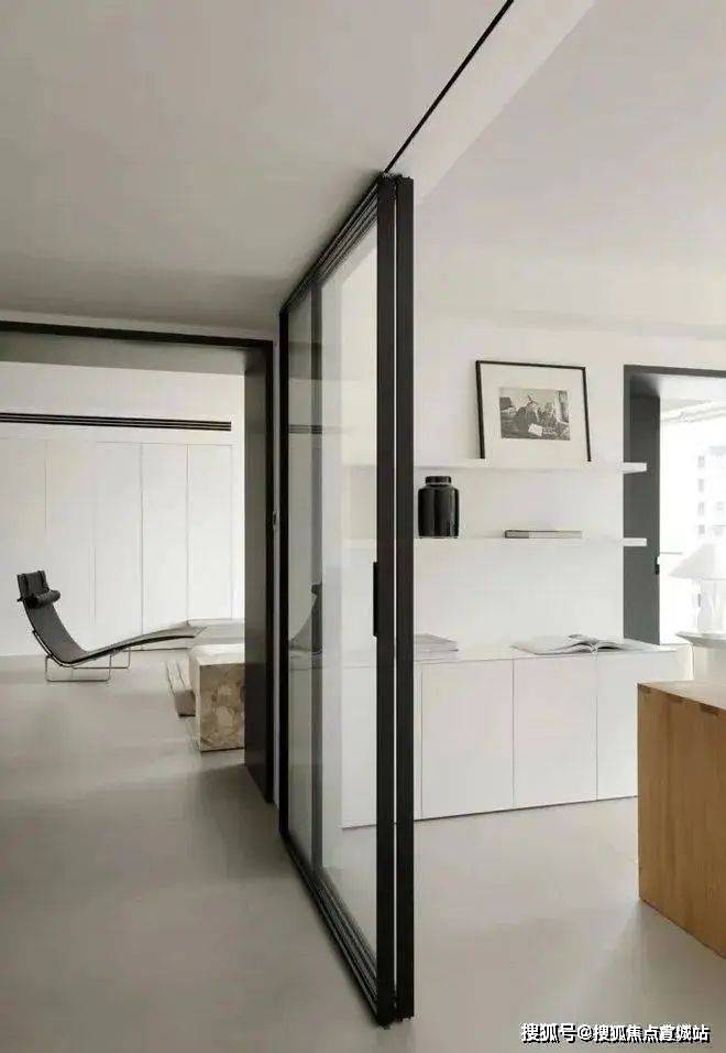 客厅沙发背后的深灰色烤漆书墙背后是书房的所在,以一扇2m长的深灰色烤漆移门控制开合,形成,形成“1+1”的可变空间组合,既满足了收纳需求,又实现了社交空间与私人空间的转换。