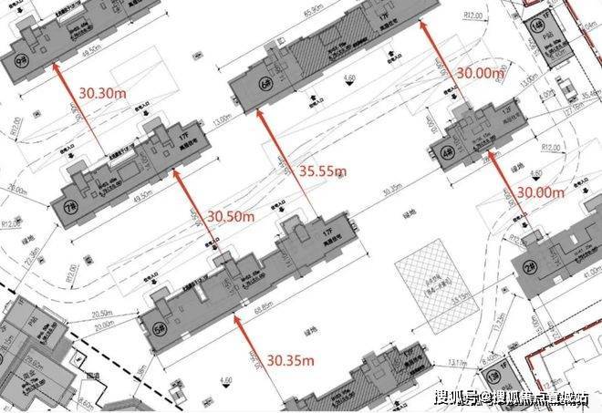 从楼栋排布来看,楼间距大约在30米左右,最大为35.55米。按照相关规定,房屋前后间距比例应保持在1:1.2,但该项目的楼间距只有楼高的0.56。
