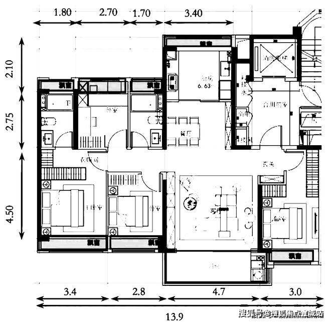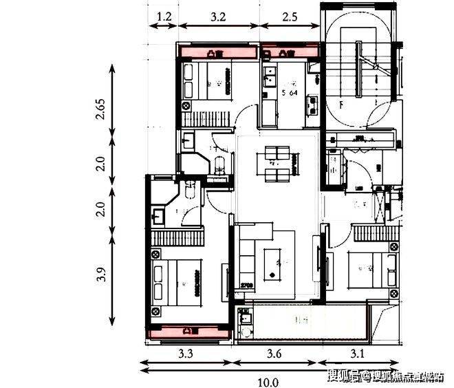 小区中央核心区域楼栋,即2#、3#、4#、5#、6#楼栋均没有连廊,且大部分是两梯两户配置,未来可能做大户型产品。小区北侧靠近主干道、西侧靠商业的位置基本是17F带连廊的楼栋,可能会安排较小的户型。