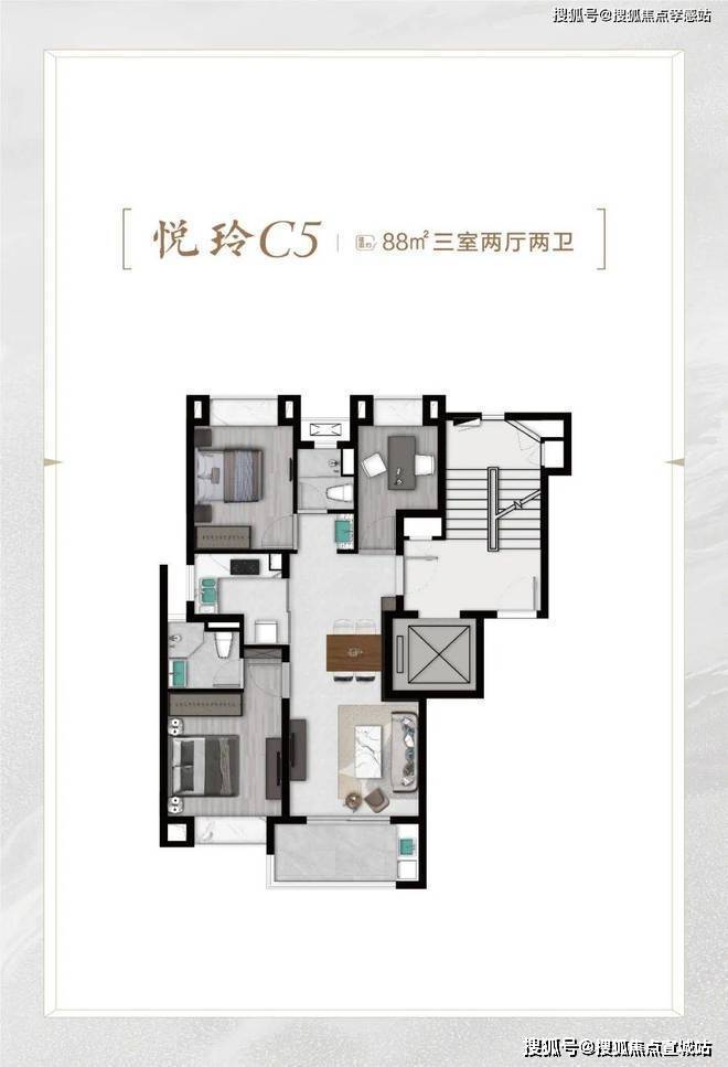再比如C6悦尊户型建面约96㎡3房2厅2卫,比C4悦奢户型少3㎡,总价也适当降低。C4户型该有的优点,也全都有,比如: